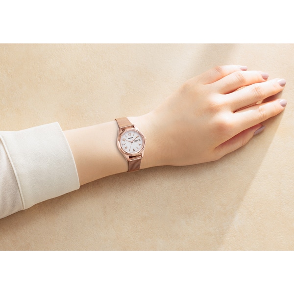 12角形ベゼルが人気を集めるデイ&デイト付きシリーズに、メッシュバンドモデルとネイビーの革バンドモデルが登場。カジュアルなファッションにも、フェミニンなファッションにも合わせやすいデザインです。メッシュバンドモデルは、シンプルで使いやすいシルバーとフェミニンなピンクゴールドの2タイプ。ご自身で簡単に長さ調節ができる仕様です。