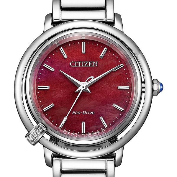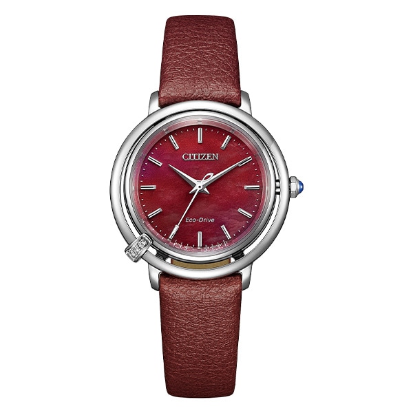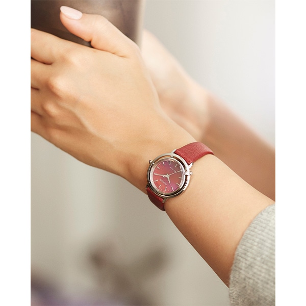 新たな始まりを告げる日の出をモチーフに、マニッシュな端正さの中にフェミニンな要素を取り入れ、あらゆるシーンやファッションにフィットするデザインです。7時半の位置では、ケースと周囲のリングをつなぐように3ポイントのダイヤモンドが連なるオーナメントを配し、日の出の最初の閃光が走る様子を表現。りゅうずには、アクセントとなる爽やかなブルーをあしらっています。光の放射を表現したインデックスと切分を配し、視認性を確保。メタルバンドとアップルレザーのバンドは、スムーズに付け替えが可能なインターチェンジャブル構造を採用。その日の気分やシーンに合わせて2WAYスタイルが楽しめます。