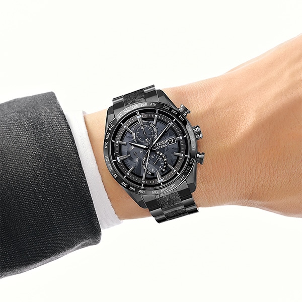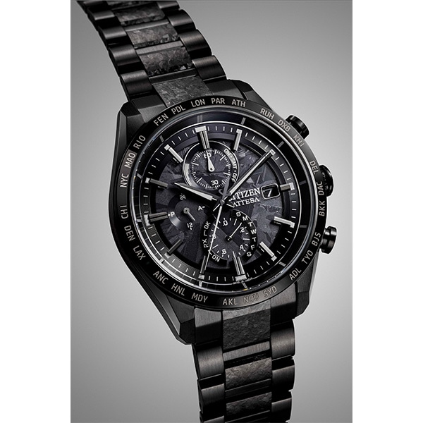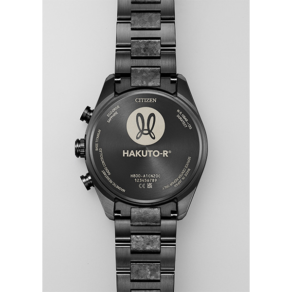 ブラックの文字板に結晶チタニウムをイメージした成形型による結晶柄をデザイン。その上にブラックの小部品を重ね、多彩なブラックが織り成す表情豊かなモノトーンに仕上げています。文字板には円弧状に輝くシルバーのアクセントをプラス。闇の先に見える光を表現しています。裏ぶたにはHAKUTO-Rのロゴをデザインしています。