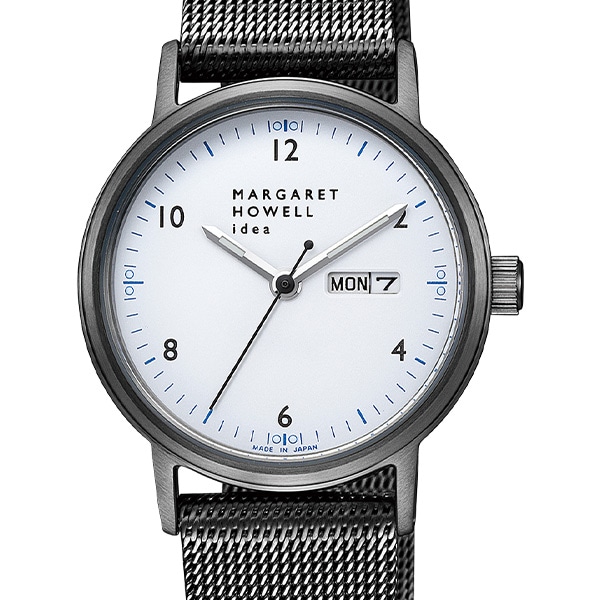 アラビア数字のインデックスは、ブランドロゴと同じフォントを採用し、マーガレット・ハウエル アイデアらしい印象に。秒針の丸点形状の尾も、さりげないデザインポイントです。