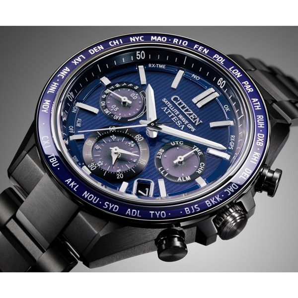 サファイアベゼルの都市名表記は、光を反射してキラキラ輝く蒸着シルバー仕様。文字板はインクジェット印刷を重ね、美しいツヤのあるストライプを表現。視認性に優れたシルバーの針とインデックスが、ダークなトーンの中で輝きを放ちます。