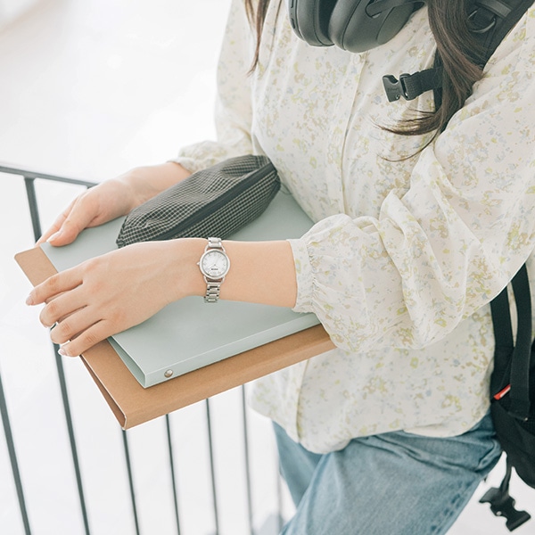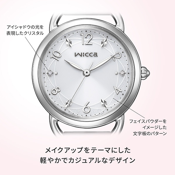 デザインテーマは「メイクアップ」。メイクをすると気分が上り気持ちが切替わるように、時計を付けることで毎日のスタートを応援したいという想いを込めてます。28mmと少し大き目なケースサイズですが柔らかなシルエットとパイプのような軽やかな足で大きさを気にせずに使えます。その日のメイクやファッションに合わせて印象を変えられる替えバンドをセット。ご自身で付替えができる構造になっています。