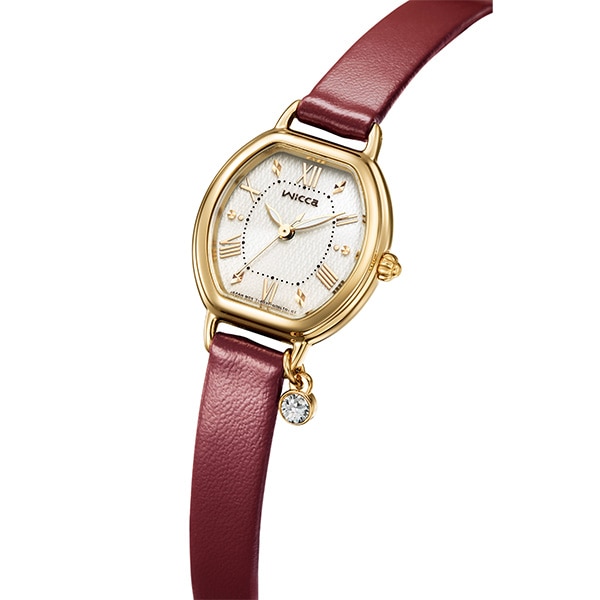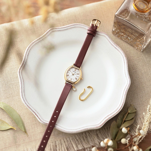 シンプルなイヤーカフがセットになった限定モデルです。文字板はあたたかみのあるベージュカラーで、ニットをイメージした型打ちパターンでバンドはこっくりとしたマホガニーカラーで、全体的に秋冬らしい配色にまとめています。チャームを外して、イヤーカフ(シルバー製)に通して使用することもでき、気分によって様々な楽しみ方ができるようになっています。
