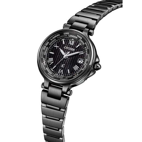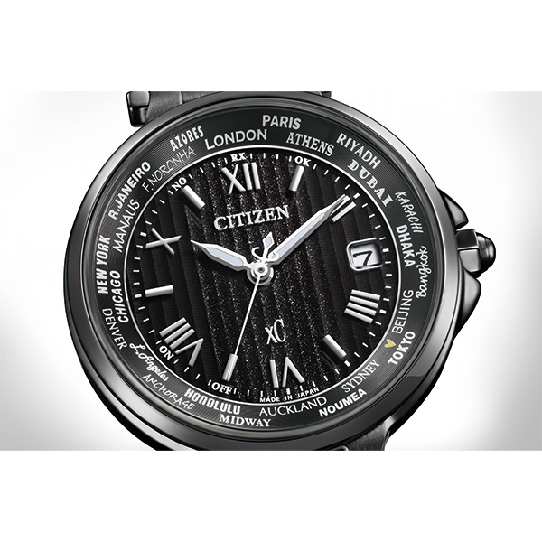 オールブラックカラーの限定モデルです。ブラックの文字盤にストライプのパターンをあしらい、12時から6時に向かってラメを施した華やかなデザイン。針とインデックスをシルバーで統一し、上品で凛とした印象を演出しました。TOKYOの位置に、さりげなくゴールドの?マークをセッティングしています
