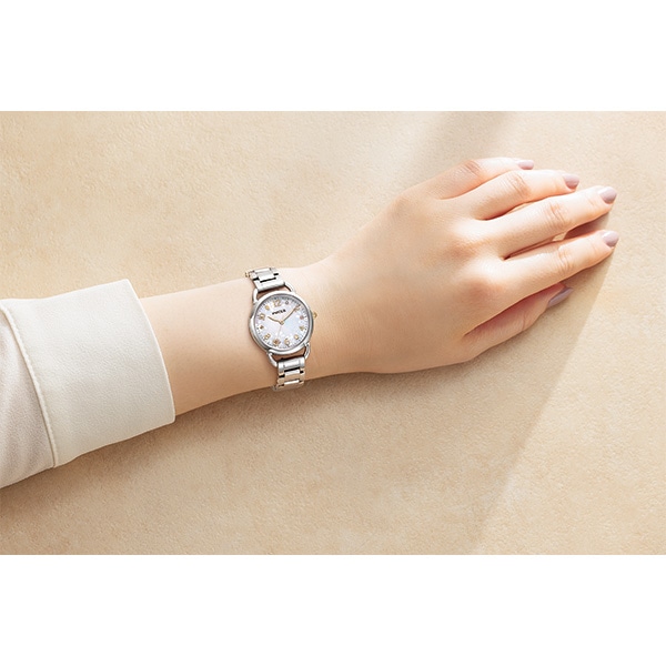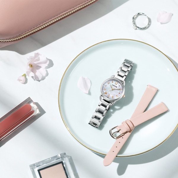 満開の桜が風で空に舞う様子をイメージした華やかな限定モデルです。白蝶貝の文字盤には風に舞う花の桜を艶やかに描いた特別感あふれるデザイン。バンドは、ユーザーご自身で手軽に付け外しができるインターチェンジャブル構造を採用しています。その日のメイクやファッションに合わせて印象を変えられる2way仕様です。