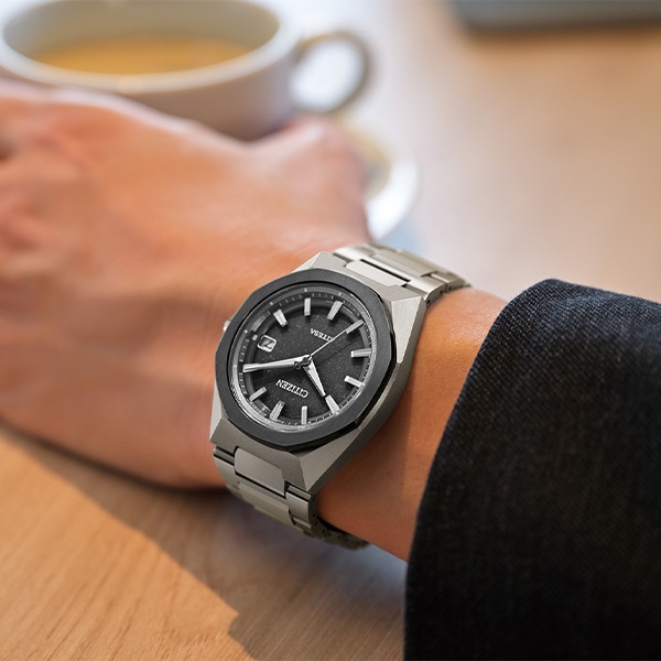 ●ザラっとした質感でチタニウムの原石をイメージした文字板と、立体感を演出する上板とインデックス。さらにメタリックな見返しリングを組み合わせた3体構造で、シンプルな中にもソリッドな印象と力強さを感じさせる仕上がりです。
