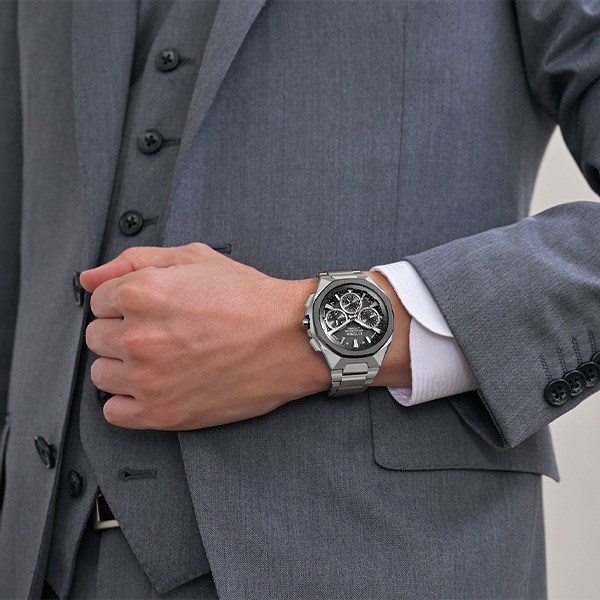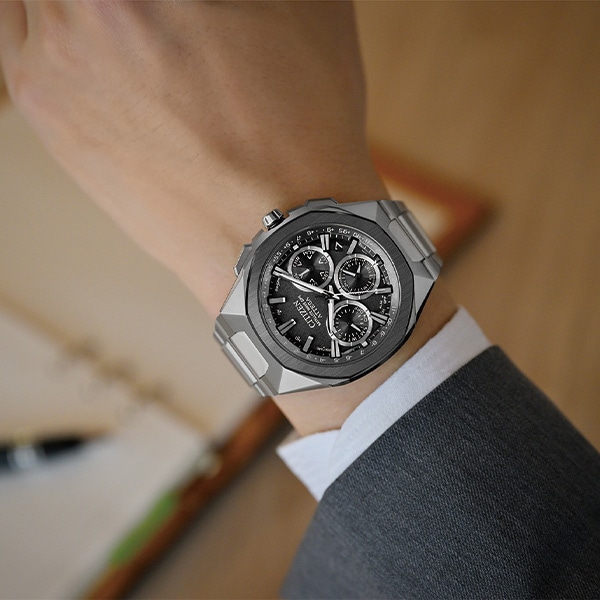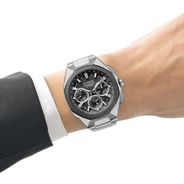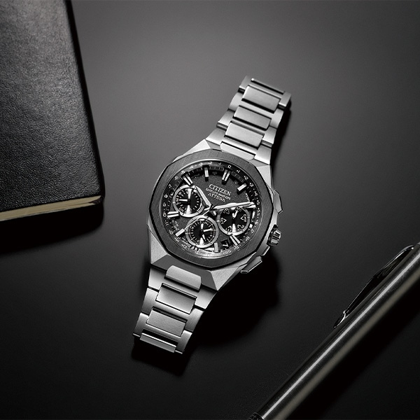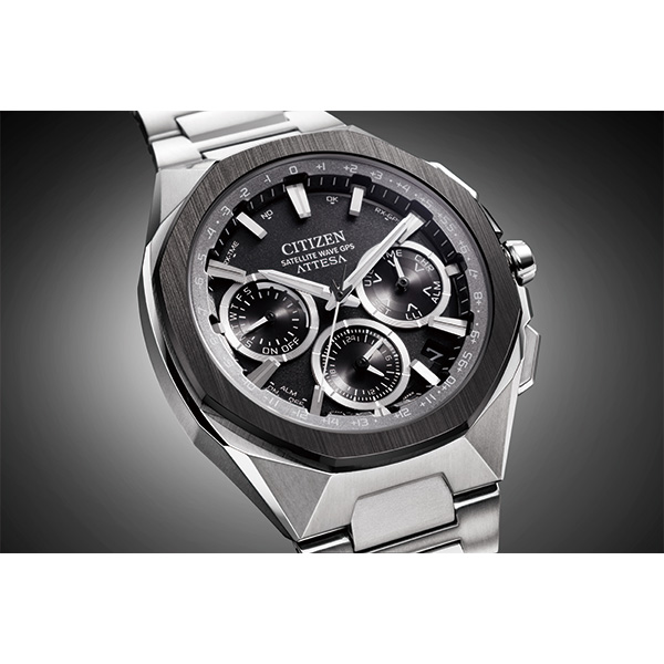 チタニウムで次世代を進み続ける、シチズン ATTESA(アテッサ)。八角形のベゼルはアテッサ初のセラミックス素材。更に、フルフローのケースに異形のプッシュボタンと、新しいスタイリングを採用。ソリッドで精悍な存在感を放つ、GPS衛星電波時計が登場。