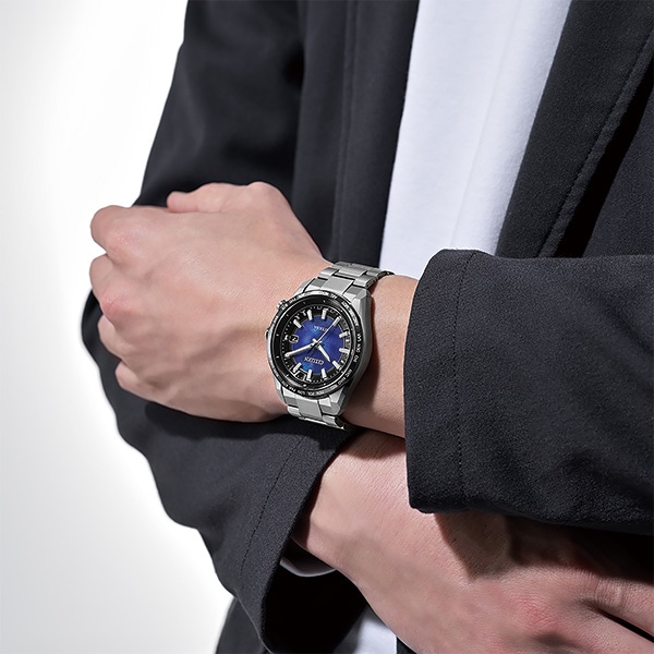 構造色の魅力を堪能できるベーシックな3針モデル。構造色フィルムの上に3枚の文字板を重ね、立体的な文字板の中心で揺らめく、青の輝きを演出。吸い込まれるような躍動感を表現しました。鏡面仕上げの光沢が映えるベゼルとブルーの差し色をプラスしたシルバーのりゅうずが、神秘的な海を思わせます。