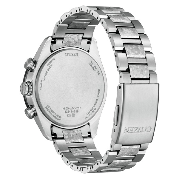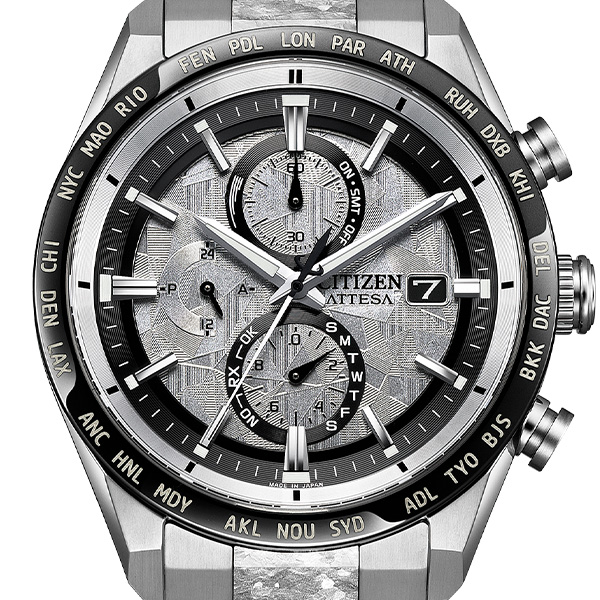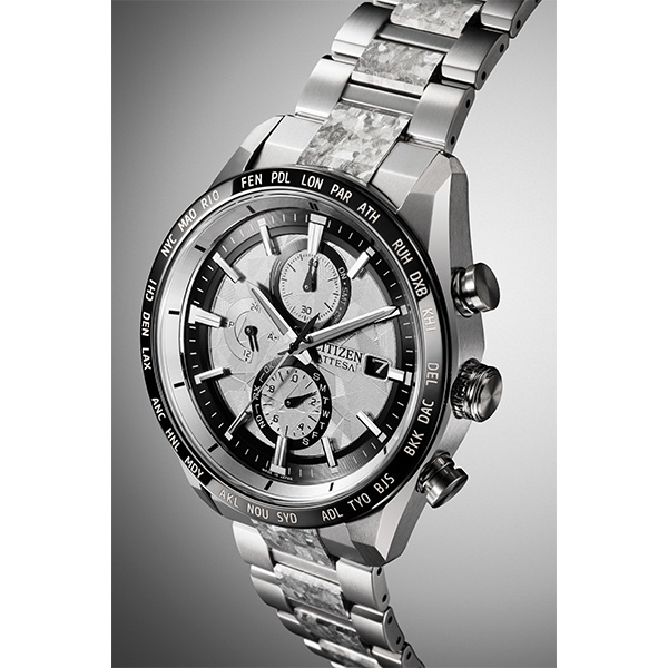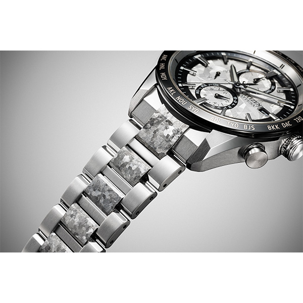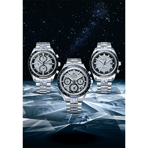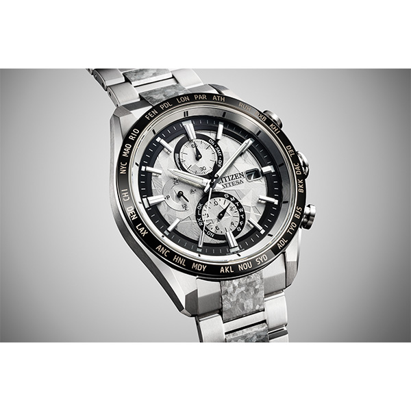 シチズン独自の技術で開発した結晶チタニウムを中駒に採用。デュラテクトプラチナを重ねることで結晶模様がプラチナの輝きをまとい、存在感を放ちます。シルバーの文字板は、結晶チタニウムをイメージしたデザインで、光に反射して表情を変えるメタリック塗装をプラス。見返しリングにも同様にメタリック塗装を施すことで、文字板や外装との一体感を演出しました。