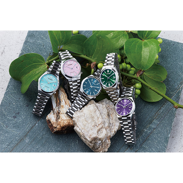 メタリックな質感の文字板に、シンプルな針とインデックスを組み合わせた3針タイプ。カレンダー部分には視認性を高める拡大鏡レンズを採用しています。文字板は、アイスブルー、グレーブルー、バイオレット、ダークグリーン、パステルピンクの5色展開。個性的なカラーの中から、自分らしい1本が見つかります。