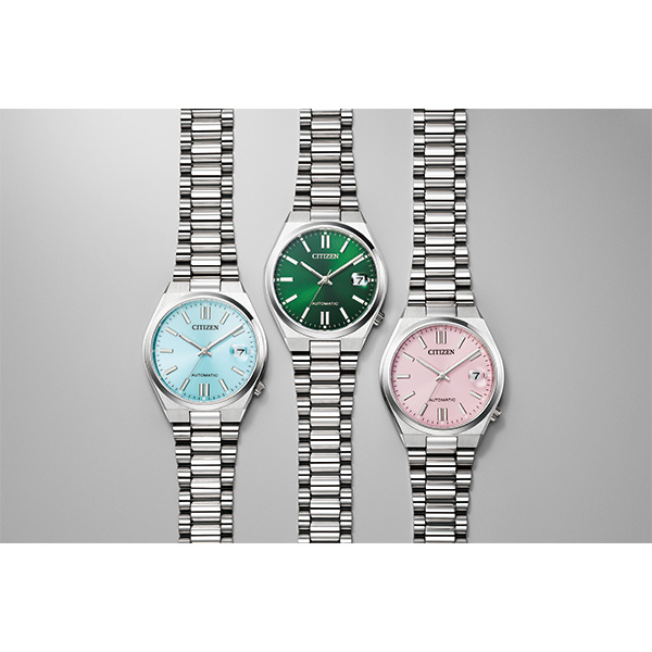 メタリックな質感の文字板に、シンプルな針とインデックスを組み合わせた3針タイプ。カレンダー部分には視認性を高める拡大鏡レンズを採用しています。文字板は、アイスブルー、グレーブルー、バイオレット、ダークグリーン、パステルピンクの5色展開。個性的なカラーの中から、自分らしい1本が見つかります。