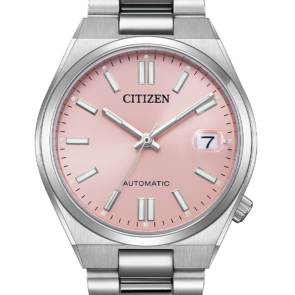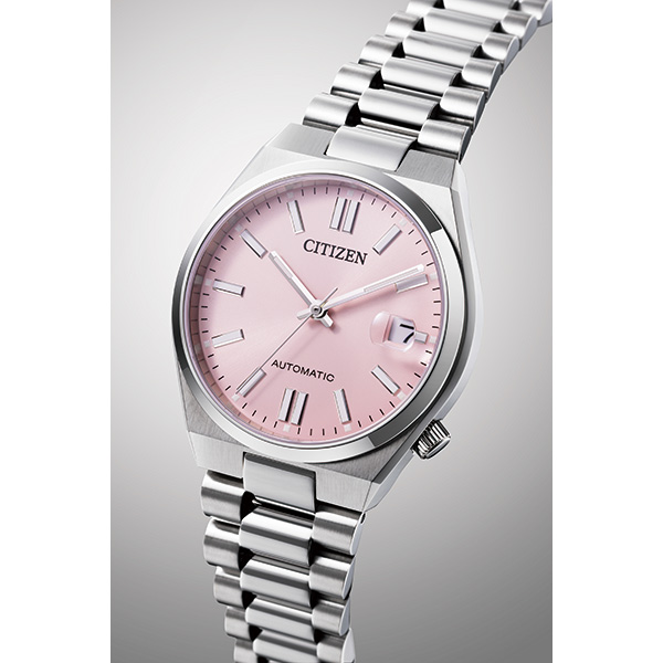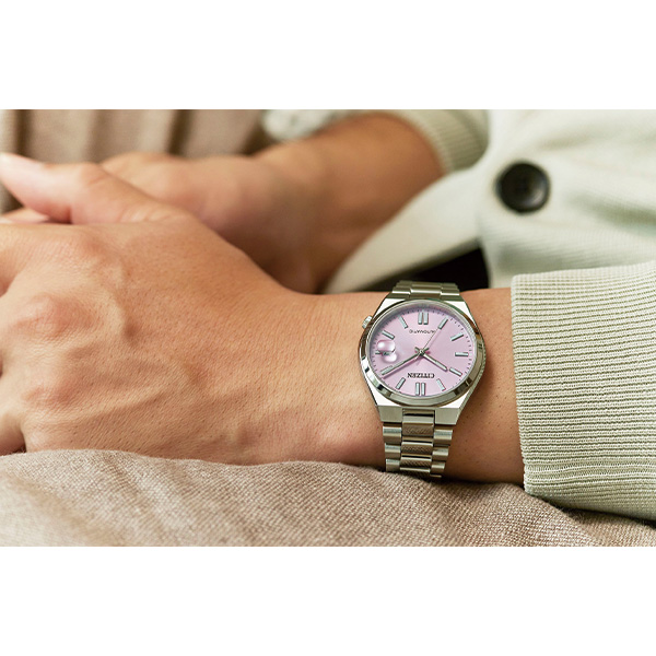 メタリックな質感の文字板に、シンプルな針とインデックスを組み合わせた3針タイプ。カレンダー部分には視認性を高める拡大鏡レンズを採用しています。文字板は、アイスブルー、グレーブルー、バイオレット、ダークグリーン、パステルピンクの5色展開。個性的なカラーの中から、自分らしい1本が見つかります。