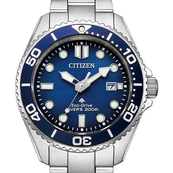 コンパクトなサイズ感と正統派のデザインにこだわった、エコ・ドライブ ダイバー200m。回転ベゼルは、外周全体にやや深めの溝を刻んだオーソドックスな仕上がりで、優れた操作性も実現しています。3連メタルバンドは、別体構造の中駒を用い、斜面をミラー仕上げにした立体感のある力強いデザイン。バックルは、ダイビングスーツを着用した際なども簡単に調整・装着できるラチェット付ダブルホールディングバックルを採用しています。中心から外側にかけてグラデーションを施した文字板は、深く澄んだ海中を表現。シンプルながらも高級感のあるフェイスに仕上げています。