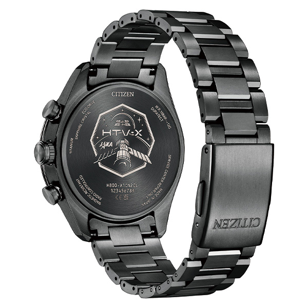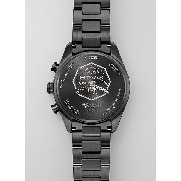 文字板を囲むインジケーターリングには、「HTV-X」が羽のように伸ばすソーラーセルをイメージした深いブルーを採用しています。裏ぶたには「HTV-X」のミッションマークを刻印しています。
