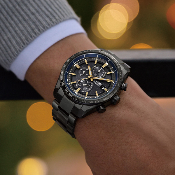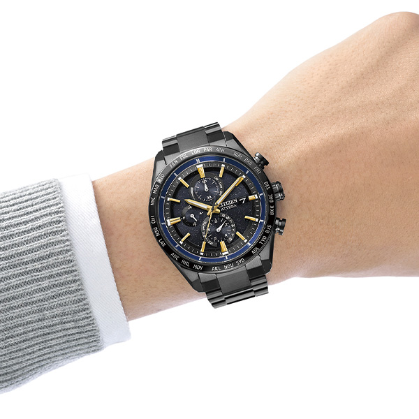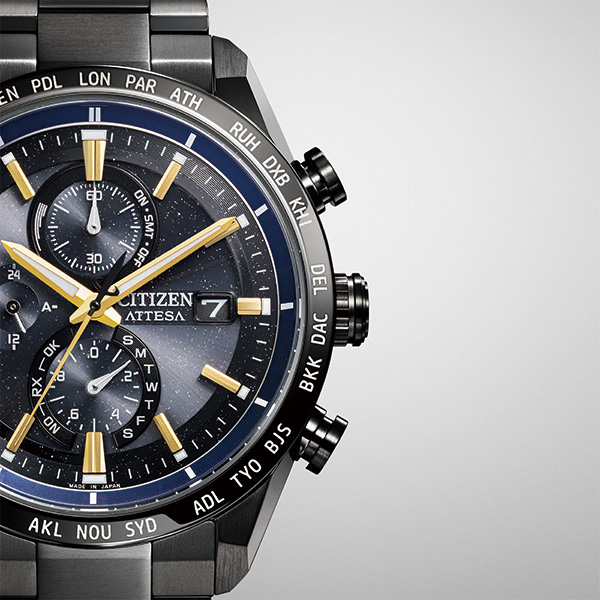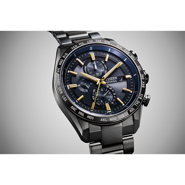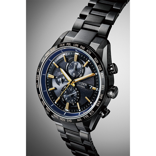 シチズンが誇る「スーパーチタニウム」で次世代を進み続ける、CTIZEN ATTESA(アテッサ)。JAXAの新型宇宙ステーション補給機「HTV-X」をイメージした限定モデル。「HTV-X」のボディに着想を得た個性的なカラーリング、ラメのきらめきを生かしたブラックの文字板が宇宙を彷彿とさせます。