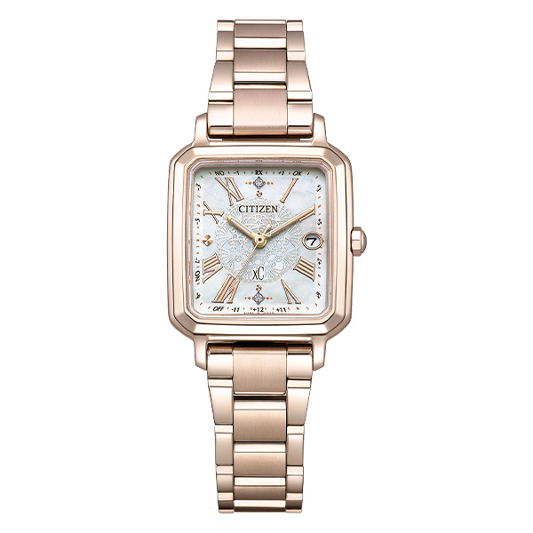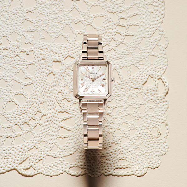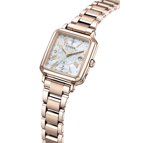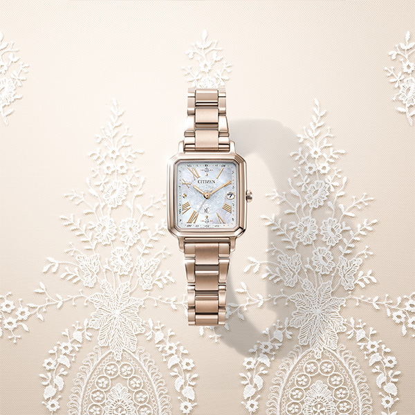 前を向く女性を応援するエンパワーウオッチブランド、シチズン xC(クロスシー)。サクラピンク®のケースと白蝶貝文字板を生かした、hikari collectionスクエア2wayモデルの限定仕様。アンティークレースをモチーフにしたクラシカルなデザインです。