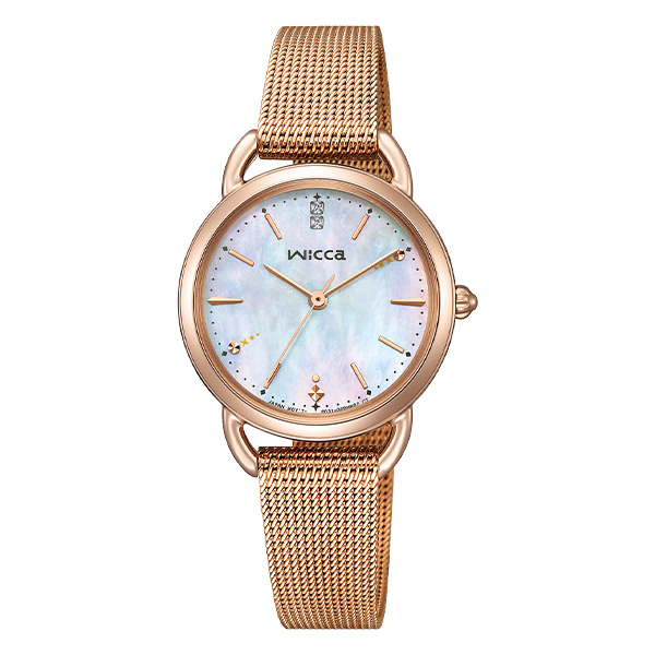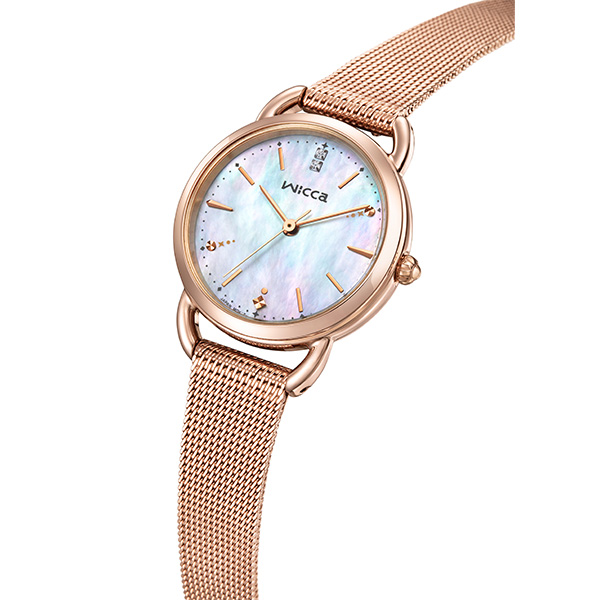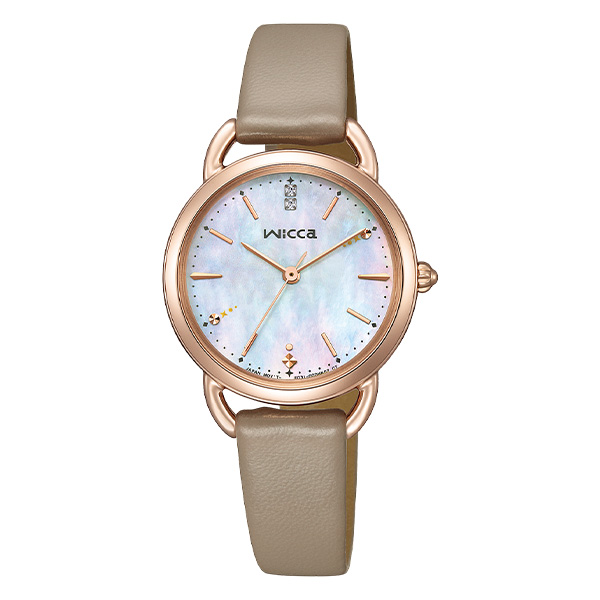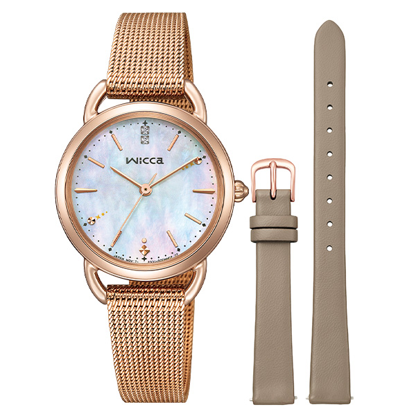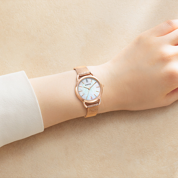 「冬の澄んだ空気」をイメージした透明感あふれるデザイン。白蝶貝文字板 にシンプルなバーインデックスを組み合わせた、アクセサリー感覚の1本です。2時と8時位置のインデックスに、雪のきらめきを表したさりげない装飾を プラス。12時の位置には2ポイントのクリスタルガラスが輝きます。その日のメイクやファッションに合わせて印象を変えられる、グレージュの 替えバンドをセットした2way仕様。ご自身でバンドの付け替えができる インターチェンジャブル構造を採用しています。