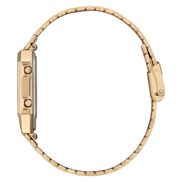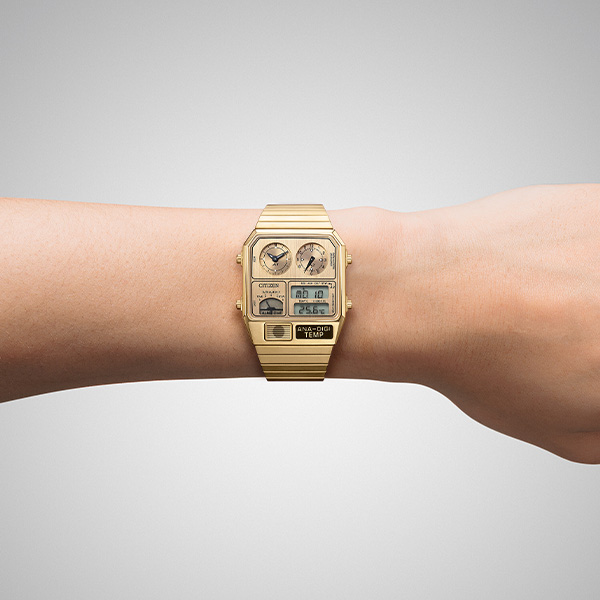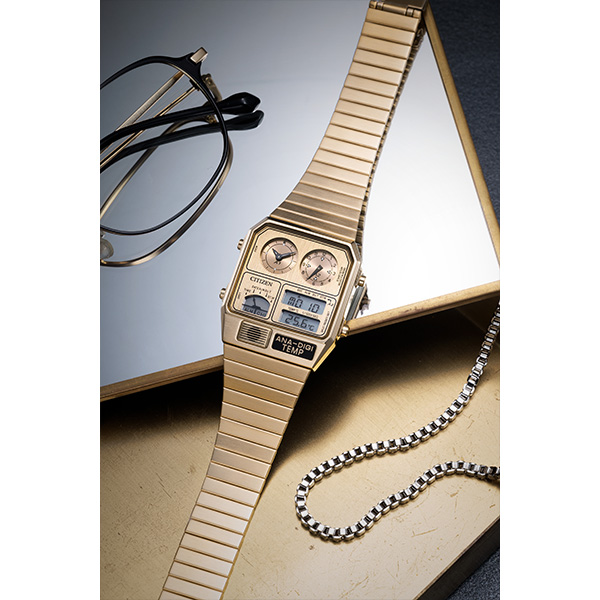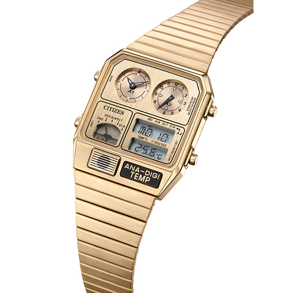 1980年代に登場した、レトロフューチャーなデザインが現在でも大人気。絶妙なサイズ感で、男女問わずユニセックスに楽しめるアナデジテンプの限定モデルです。ケース、バンド、文字板すべてにステンレスを使い、全体をワンカラーでまとめた高級感あふれるフルメタル仕様。文字板の上板に施した粗いヘアラインが、メタルの質感をきわだたせています。スタイリッシュなシルバー、華やかなイエローゴールド、より限定感のあるウォームゴールドの3色展開です。