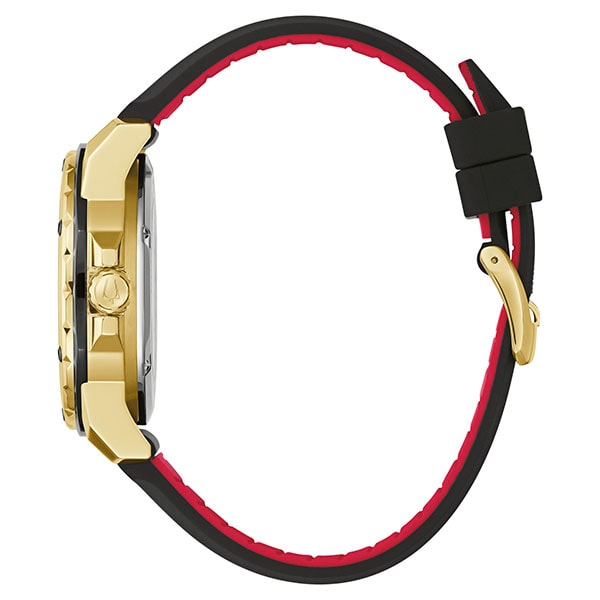 1970年代に誕生したブローバの代表コレクション、マリンスター。高気圧防水で優れた機能を備える実用時計でありながら、気品にあふれたスポーティーな表情とラグジュアリーなデザインが特徴です。豊富なカラーバリエーションが揃い、オン・オフを問わずたのしめるコレクション。なだらかな八角形を描くオクタゴンケースと、ベゼルに打たれた6個のビスが特徴の精悍な顔立ち。ブラックを基調としたシックなカラーリングに、細やかな放射状のギョーシェ装飾がラグジュアリーなムード漂う一本です。