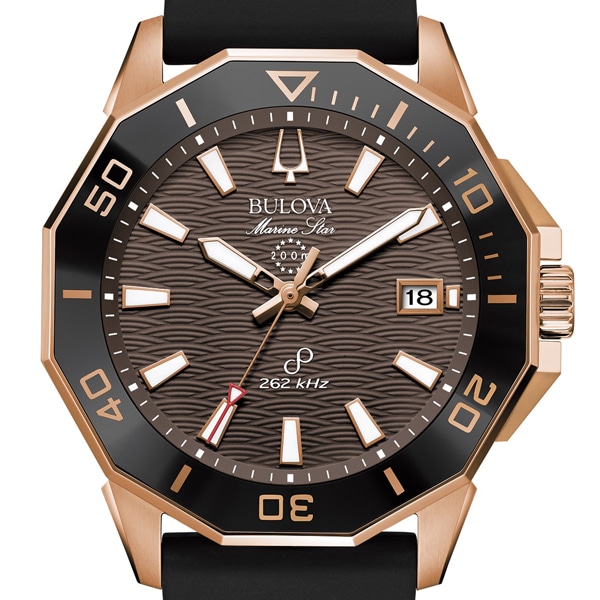 高気圧防水を備えながら、気品あふれるラグジュアリースポーティーなデザインのマリンスター。新製品の「シリーズC」は、「262kHzの高振動による月差±5秒の高精度」と「1秒間に16ステップ動く滑らかなスイープ運針」が特徴の、ブランド独自のプレシジョニストクォーツを初搭載。ローズゴールドの12角形のポリゴンケースに艶やかなブラックセラミックのトップリング、そしてブラウンダイヤルには、夏の海の波を連想させるテクスチャーを合わせました。また、ラバーストラップの裏には模様を入れることで汗を逃がしやすい工夫を施しています。20気圧防水にねじ込み式リューズ、逆回転防止ベゼル、インデックスと3針の夜光仕様といった、ダイバーズウォッチに匹敵する本格機能も備えるマリンウォッチです。