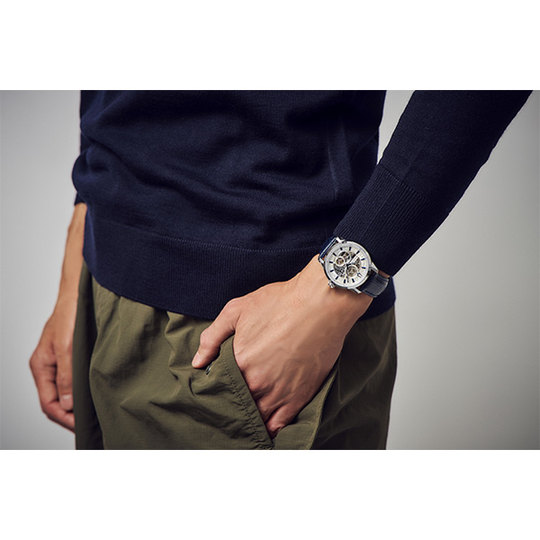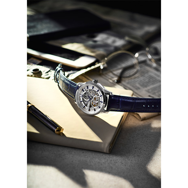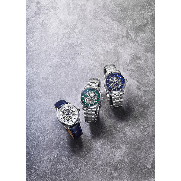 クラシックコレクションから小さめケースの新作が登場。 特徴的なオープンスケルトン文字板の機械式モデル。文字板の部品をムーブメントのパーツの流れに沿って配置する ことで、他社には真似できない多層感と複雑さを表現して います。クラシカルで高級感のある雰囲気ながら、手頃な 価格を実現したエレガントでスタイリッシュなモデルです。また、従来よりサイズダウンした40mmのケースは、ユニ セックスで着用できるため、幅広い顧客層にご愛用いただけます。