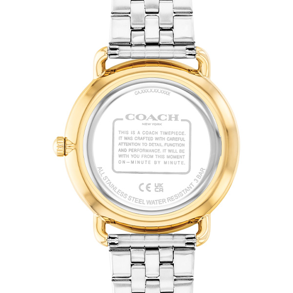 文字盤はサンレイ仕上げが施されており、光の角度によって美しい放射状の輝きを放ちます。インデックスはシンプルなバータイプで、視認性とエレガンスを両立しています。3時位置には、コーチのアイコニックな「C」ロゴが配置されており、さりげないブランドらしさを演出しています。「COACH NEW YORK」のロゴが中央に配置されています。