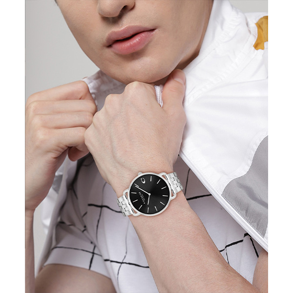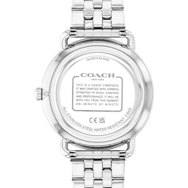 文字盤はサンレイ仕上げが施されており、光の角度によって美しい放射状の輝きを放ちます。インデックスはシンプルなバータイプで、視認性とエレガンスを両立しています。3時位置には、コーチのアイコニックな「C」ロゴが配置されており、さりげないブランドらしさを演出しています。「COACH NEW YORK」のロゴが中央に配置されています。