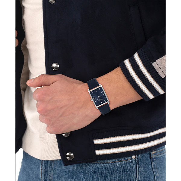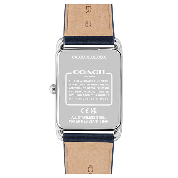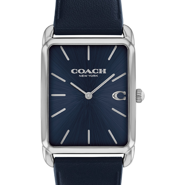 縦長の長方形(レクタングル)ケースが、腕をすっきりと見せてくれます。文字盤は、放射状のサンレイ仕上げが施されており、光の角度によって美しい輝きを放ちます。インデックスはシンプルなバータイプで、余計な装飾を排したミニマルなデザインです。3時位置には、コーチのアイコニックな「C」ロゴがさりげなく配置されており、ブランドらしさを感じさせます。