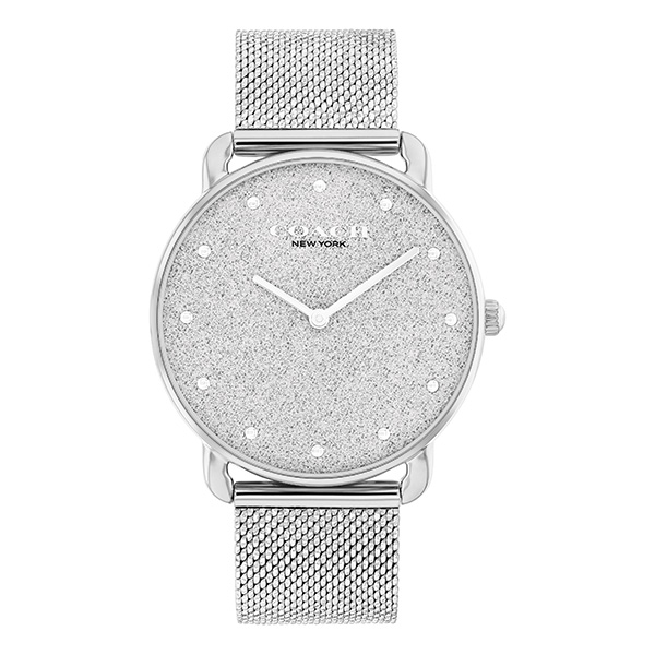 シンプルなラウンドケースは、どんなスタイルにも合わせやすいタイムレスなデザインです。最も特徴的なのは、きらめくテクスチャが施された文字盤です。まるで雪が降っているかのような、または夜空の星々のような、ユニークな輝きを放ちます。このラメ入りのようなテクスチャが、シンプルながらも個性を際立たせています。