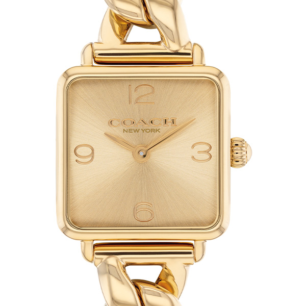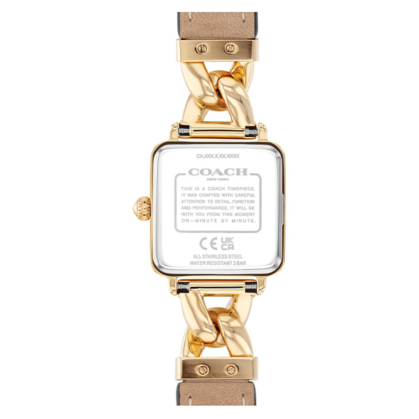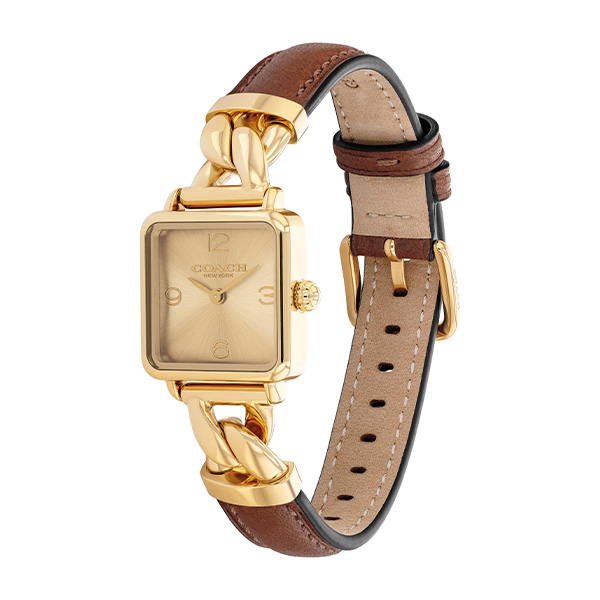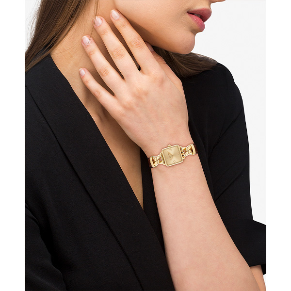 丸みを帯びたスクエアケースが、クラシックでありながらモダンな印象を与えます。最も特徴的なのは、大胆なチェーンリンクとレザーの組み合わせからなるバンドです。光沢のあるの太いチェーンが、まるでブレスレットのような存在感と華やかさを演出します。