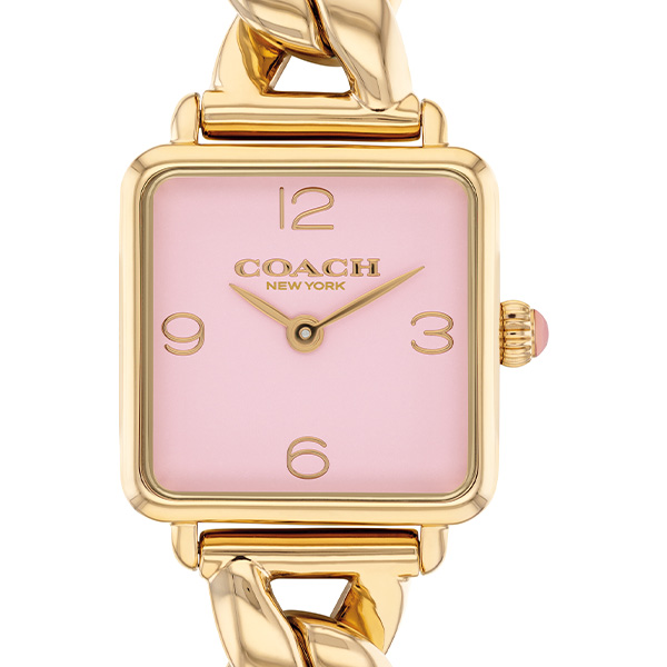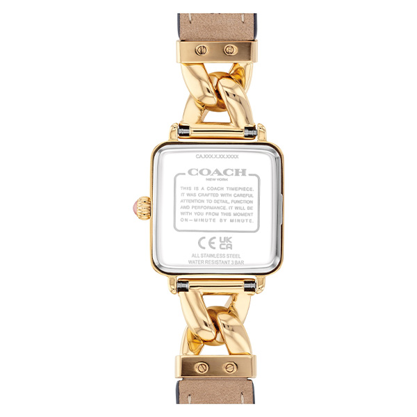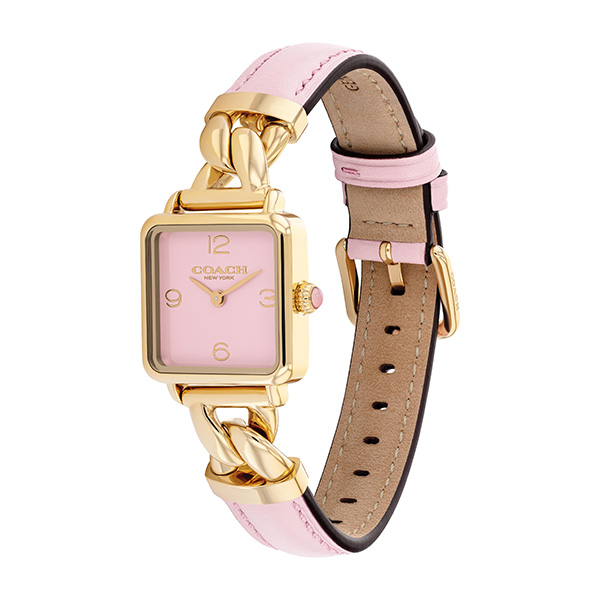 丸みを帯びたスクエアケースが、クラシックでありながらモダンな印象を与えます。最も特徴的なのは、大胆なチェーンリンクとレザーの組み合わせからなるバンドです。光沢のあるの太いチェーンが、まるでブレスレットのような存在感と華やかさを演出します。