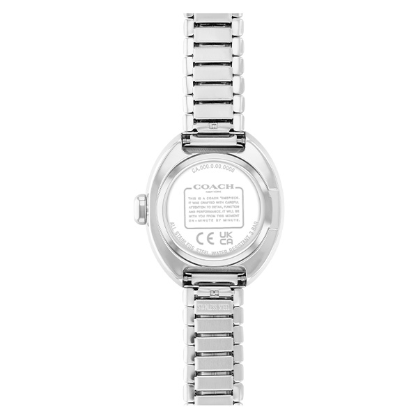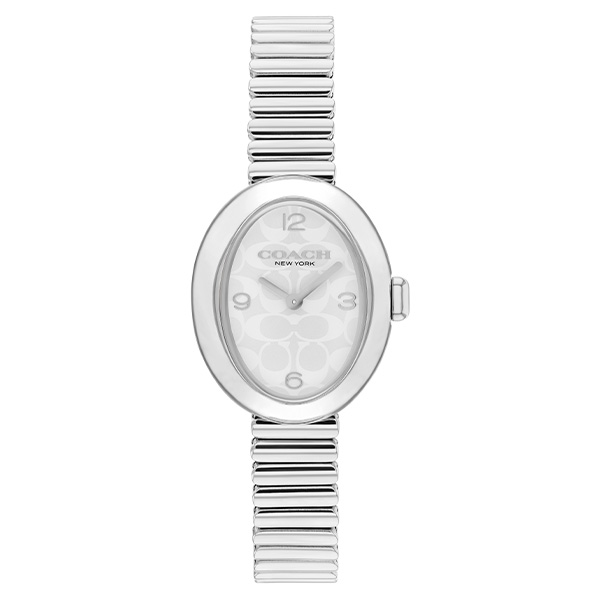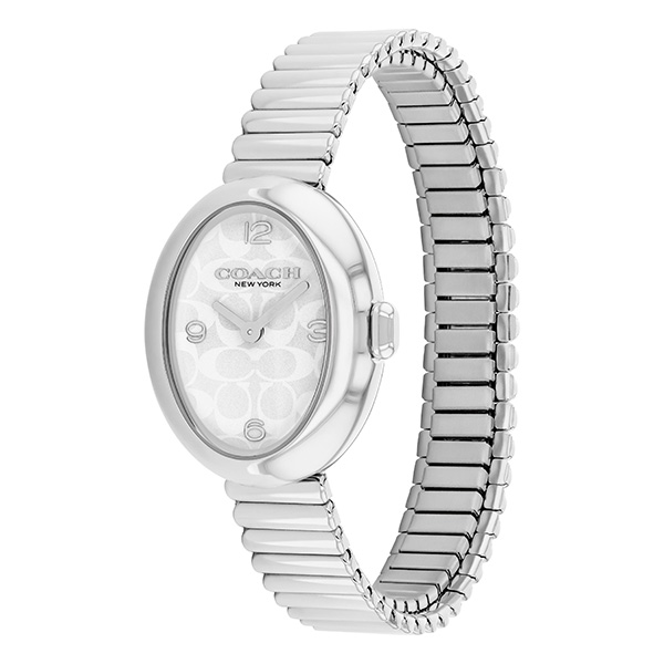 楕円形のケースは、女性らしい柔らかな印象を与えます。文字盤には、コーチのアイコニックな「C」のモノグラムパターンが淡くデザインされており、ブランドらしさをさりげなく主張しています。ベルトは蛇腹ベルトを採用しており、伸縮性に優れ、着脱が楽な使用になっております。ブレスレットとしてもおすすめです。