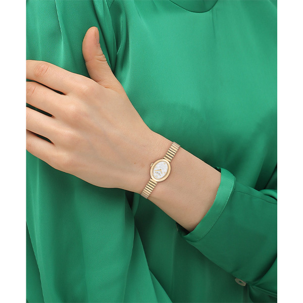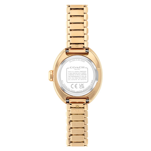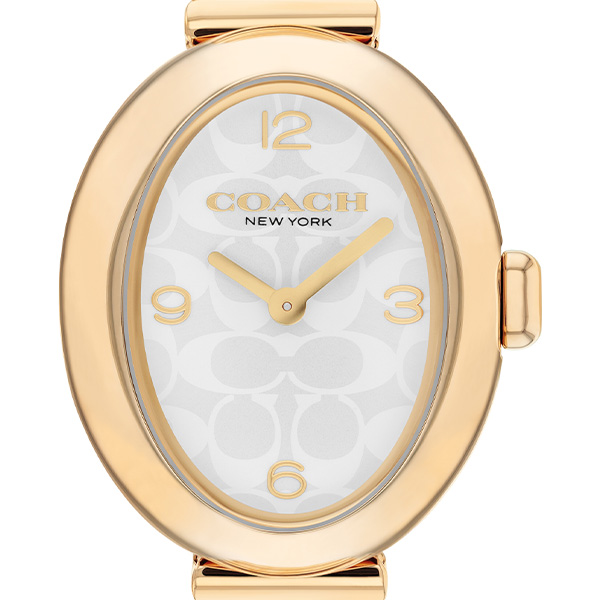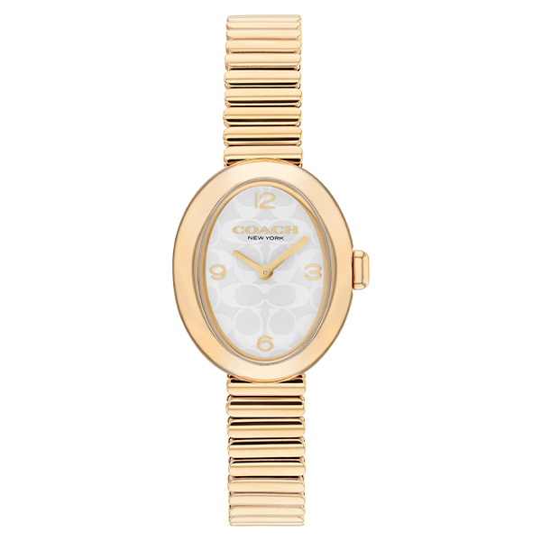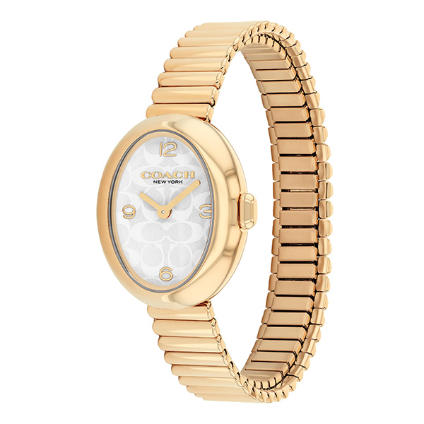 楕円形のケースは、女性らしい柔らかな印象を与えます。文字盤には、コーチのアイコニックな「C」のモノグラムパターンが淡くデザインされており、ブランドらしさをさりげなく主張しています。ベルトは蛇腹ベルトを採用しており、伸縮性に優れ、着脱が楽な使用になっております。ブレスレットとしてもおすすめです。