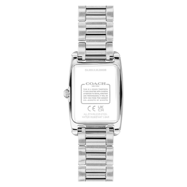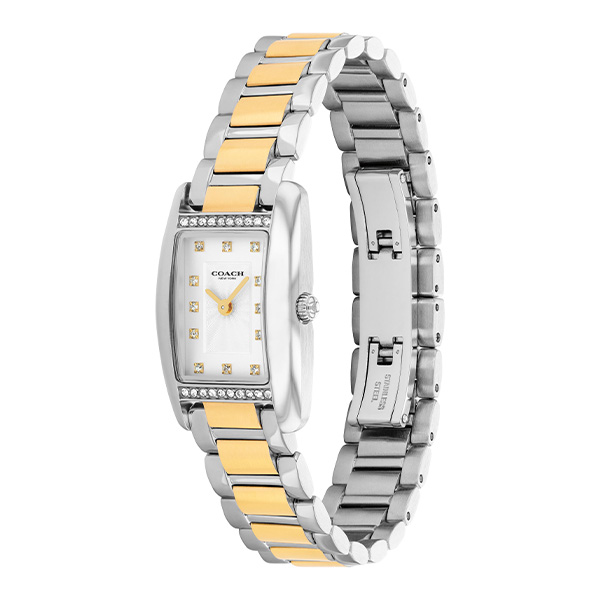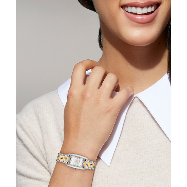 丸みを帯びたスクエアケースが、柔らかさと洗練された雰囲気を両立させています。ケースの上下(ラグ部分)には、華やかなストーンがあしらわれており、手元に輝きを添えます。
