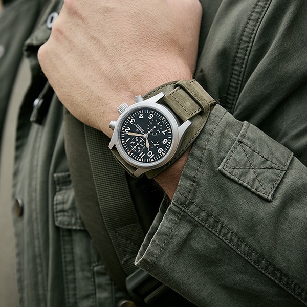 ラギッドで強靭、確かな精度を約束する「カーキ フィールド オートクロノ」は、冒険心を掻き立てるタイムピースです。44mmのビックサイズケースは、サンドブラスト加工が施されたステンレススチールを採用。ケースバックには特別なエングレービングが施され、ハミルトンのミリタリーヘリテージを讃えます。スーパールミノバ加工された立体的なインデックスが高い視認性を実現し、ダイヤルに立体感を与えます。装着感に優れたレザーのBUND(ブンド)ストラップが機能美を引き立て、新たな冒険へと誘います。
