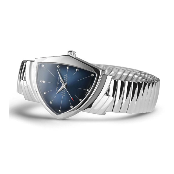 1957年、ハミルトンは世界初の電池式腕時計である「ベンチュラ」を発表しました。この革新的なタイムピースは、フューチャリスティックなデザインの象徴、そして革新のシンボルとしてその名を馳せ、ウォッチメイキングに新たな時代をもたらしました。エルヴィス・プレスリーの大ヒットシングル『ブルー・スエード・シューズ』にインスパイアされた「ベンチュラ」は、ニッケルの時針、分針、秒針を備え、高い信頼性を誇るクォーツムーブメントを搭載しています。アイコニックな三角形のステンレススチール製ケースにはフレックスブレスレットが組み合わされ、ディープブルーのダイヤルがエルヴィスの有名なシューズを思い起こさせます。