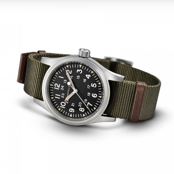 38mmのつや消しステンレススチールケース、3針表示、ダークカラーのダイヤル、蛍光塗料があしらわれたインデックス、そして耐久性に優れたNATOストラップ。新しい「カーキ フィールド メカ」は、1960年代のオリジナルモデルを忠実に復刻し、ハミルトンのミリタリーウォッチの歴史を色濃く反映しています。ミリタリールーツに根ざしたた機能美を感じさせるタイムピースです。