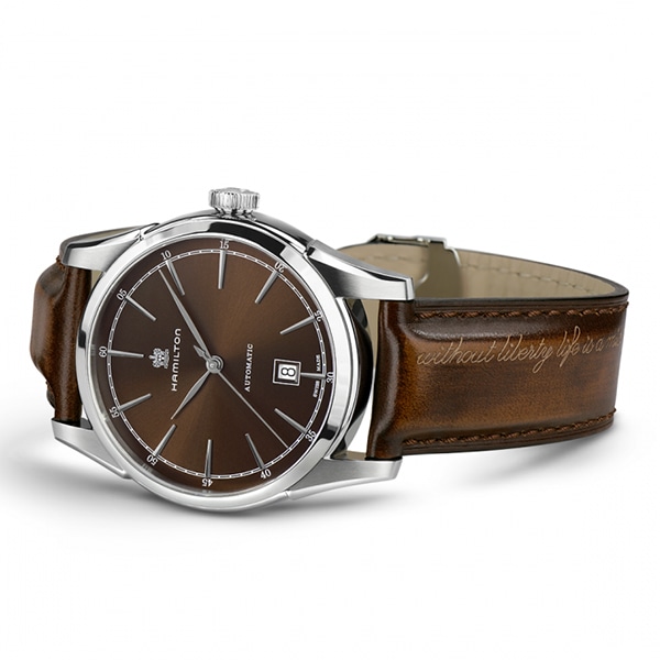 1892年ハミルトン創業当時のクラシカルなアメリカンスタイルを備えた革新的な自動巻きモデルの中に今も息づいています。80時間の標準持続時間を備えたH-10自動巻きムーブメントに、21世紀のウォッチメイキングを融合。週末に時計を使用しなくても月曜日の朝でも正確な時刻を刻んでいます。