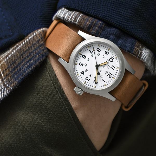 38mmのつや消しのステンレススチール製ケース、3針表示、ホワイトのダイヤル、オールドラジウムカラーのスーパールミノバRを塗布した三角形のインデックス、耐久性に優れたNATOストラップ。新しい「カーキ フィールド メカ」は、1960年代のオリジナルモデルに忠実なモデルであり、ハミルトンのミリタリーウォッチのDNAを色濃く反映しています。本物のミリタリースピリットを宿すラギッドで堅牢なタイムピースです。