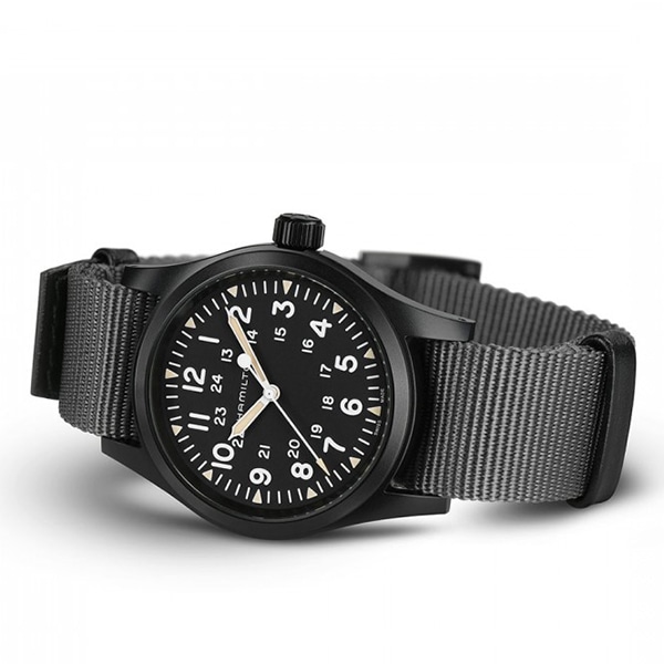 ブラックとグレーのカラースキームが新しい「カーキ フィールド メカ」。ミリタリールーツに根差した機能美を備え、38mmサイズのケースにはH-50手巻きムーブメントを搭載。オールドラジウムカラーのスーパールミノバを施した三角形のインデックス、耐久性の高いNATOストラップが腕元を引き立てます。