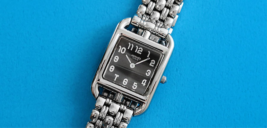 エルメスは当時のクリエイションを手掛けていたアンリ・ドリニーに正方形の時計デザインを依頼。 そして1991 年、彼が好きな長方形ケースに正方形ダイヤルを重ね、生み出したのがケープコッド。 錨の鎖をモチーフにしたエルメスのジュエリー「シェーヌ・ダンクル」に着想を得たデザインが特徴。
