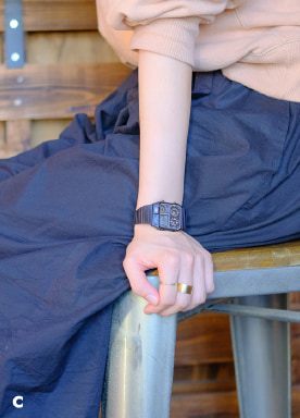 シンプルな装いには目を引くアクセントとなるアナデジテンプ、