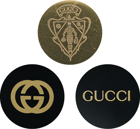 グッチは二代目が品質保証のため、創業者グッチオ・グッチのイニシャル「GG」をマークとして製品に入れたことから、世界で初めてデザイナーの名前を製品に入れたことで知られています。1930年代のロゴマークには、サヴォイ・ホテルでポーターをしていた若かりし頃のグッチオ・グッチをモチーフにしたと言われるホテルマンのロゴが見られます。1950年代には、両手にカバンを抱えた鎧を纏う騎士、そしてバラと舵をモチーフとした「グッチ クレスト」と呼ばれるエンブレムが使用され、このマークはオールドグッチの時計の裏蓋にもよく見られます。そのほか年代によってバッグには筆記体のロゴも見られるなど、様々なロゴマークが存在します。