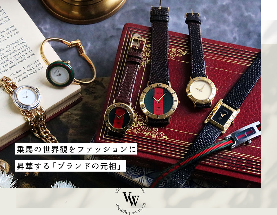 グッチの製品にはバッグやシューズだけでなく、腕時計にも乗馬にインスパイアされたモチーフが使われています。グッチのブランドを印象付けるアイコンカラー、レッド×グリーンの「ウェブストライプ」は、馬の鞍を安定させるための腹帯がモチーフ。また、6300Lに見られる特徴的なケースデザインは「ホースビット」と呼ばれ、馬に噛ませる“くつわ”をモチーフにしており、ローファーやバッグなどにも使用されています。