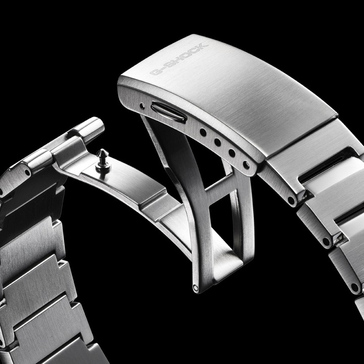 メタルバンドの接続部分にはウレタン樹脂製の緩衝パーツを採用し、バンド接合部に加わる衝撃を吸収を高めています。